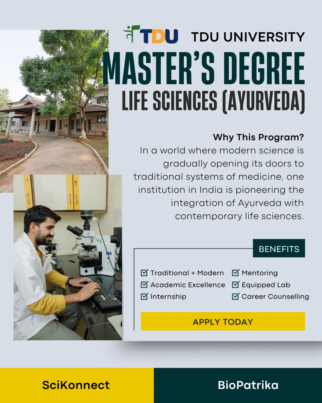 Through Campus Konnect by BioPatrika, we had the opportunity to feature in-depth interviews with faculty and alumni of TDU’s MSc Life Sciences (Ayurveda Biology) program. These discussions offer valuable insights for BAMS graduates, science enthusiasts, and aspiring Ayurveda researchers looking to build careers beyond clinical practice.