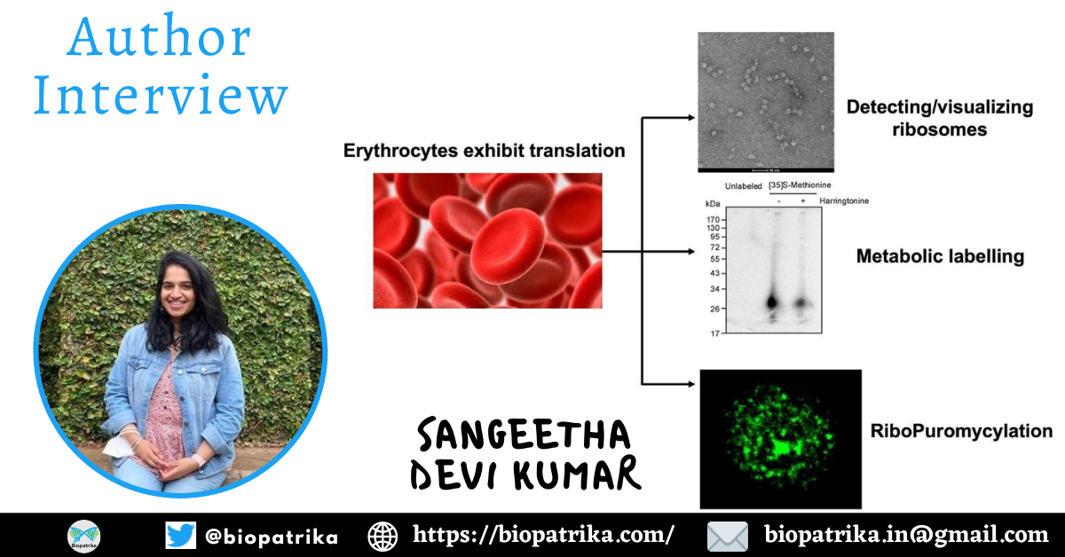 ![Schematic showing the different methods to visualise proteins being synthesised in red blood cells. In the first panel, ribosomes can be seen as pearls on a string under an electron microscope, forming long chains, which is indicative of protein synthesis. In the second panel, a radioactive signal in the [35]S-methionine lane indicates that the radioactive amino acid is being taken up, suggesting active protein synthesis. In the third panel, fluorescence signal is observed in a red blood cell which is a measure for new proteins being made.](https://biopatrika.com/wp-content/uploads/2022/10/Sangeetha-Devi-Kumar1.jpg)