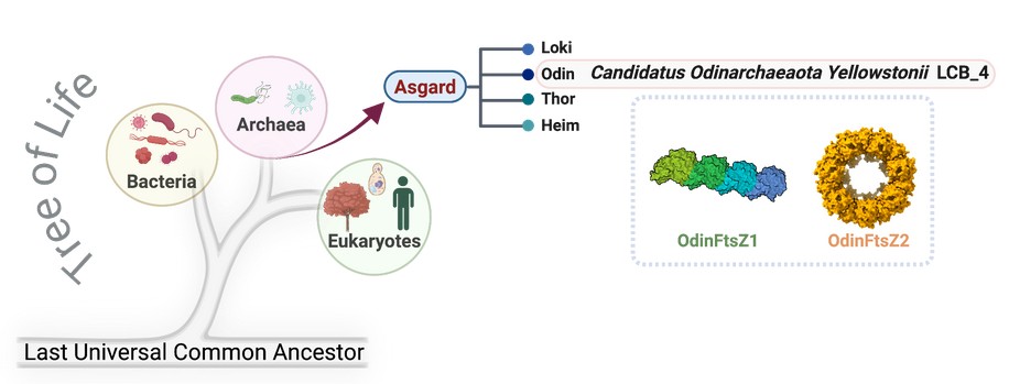 In our research, we focused on Odinarchaeota yellowstonii, named after the Norse god Odin and first isolated from Yellowstone National Park, USA. This lineage is fascinating because it encodes multiple FtsZ proteins, part of the tubulin superfamily that later gave rise to the building blocks of eukaryotic microtubules.
