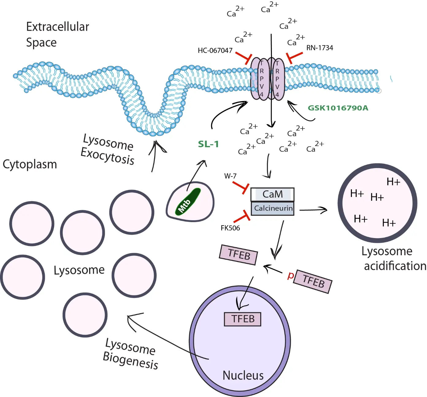 To explore how TRPV4-mediated calcium signals lead to lysosomal biogenesis, we dissected the downstream pathway. Our results indicate that calcium influx through TRPV4 activates the calcium-binding protein Calmodulin, which in turn activates Calcineurin, a phosphatase that dephosphorylates and activates TFEB, the master transcription factor for lysosome and autophagy genes. This leads to nuclear translocation of TFEB and transcriptional upregulation of lysosomal genes. Additionally, through high-resolution fluorescence imagining, we found that TRPV4 is not restricted to the plasma membrane, but is also present on intracellular membranes, including Mtb-containing phagosomes and lysosomes.