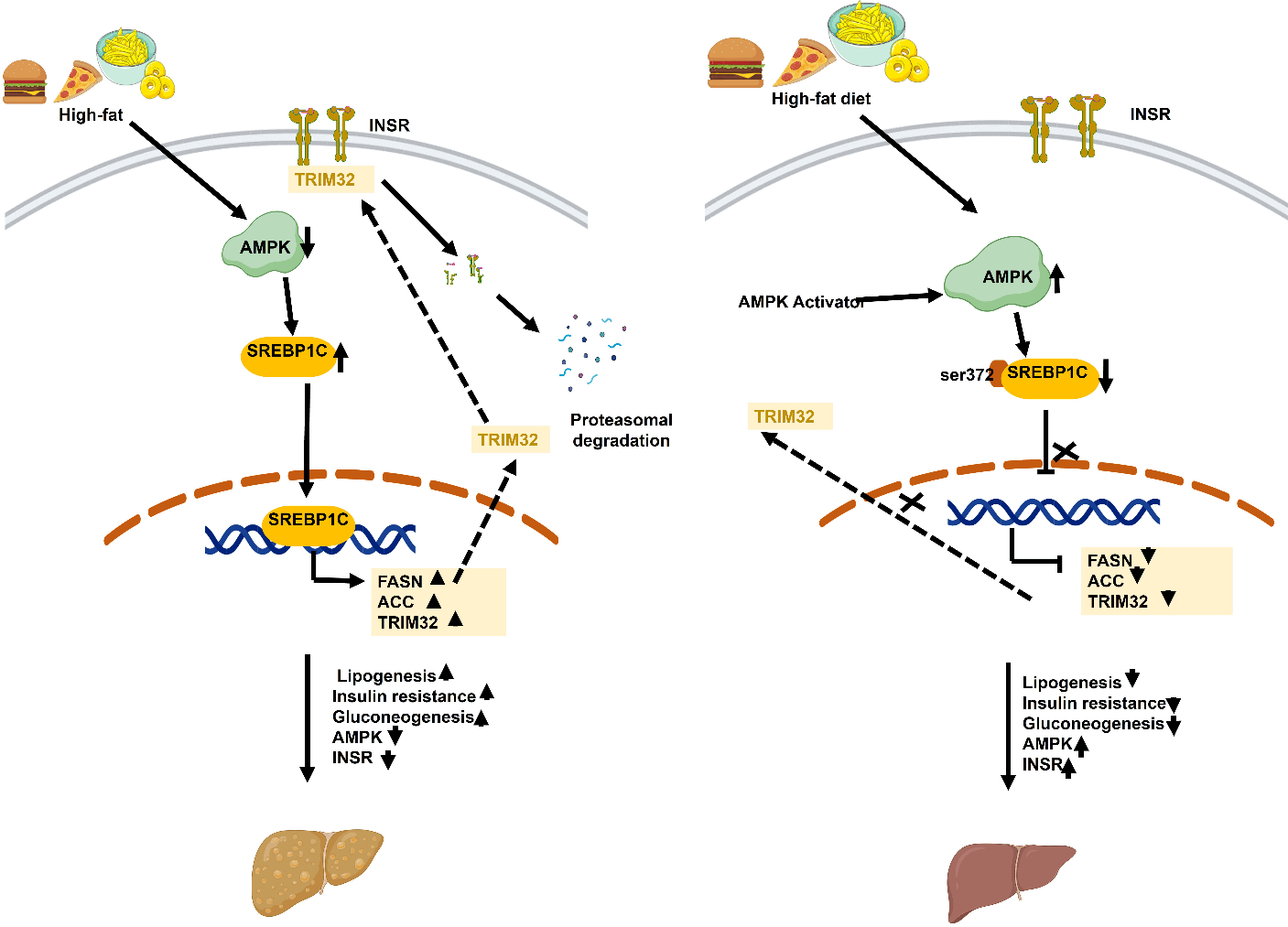 Diet rich in fat, carbohydrates lead to an increase insulin secretion and people suffering from bad eating habits have insulin spikes even without meals. Higher glucose as well as insulin levels are the key features of the patients suffering from Type 2 Diabetes often leads to fatty liver and vice versa. This gradually develops insulin resistant state in the cells. The glucose from diet cannot be further metabolized by the metabolically active organs. Having diet rich in fat, carbohydrates leads to increased SREBP1-c transactivation from cytosol to nucleus and further increases the transcription of TRIM32 gene. This increased TRIM32 degrades insulin receptors and makes the situation more severe. Our study provides a novel insight into the therapeutics targeting liver TRIM32. We saw that treating cells with an AMPK activator protects from TRIM32-induced fatty liver and insulin resistance.