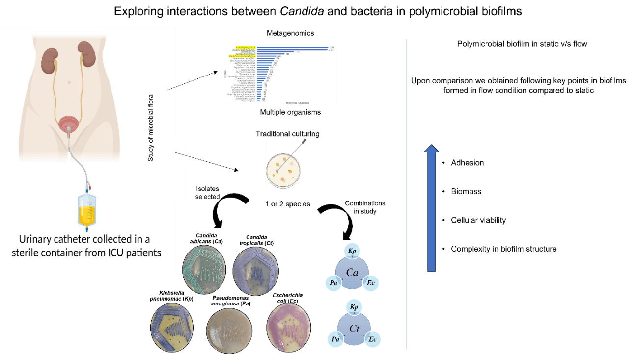 The study was initially driven by a curiosity to investigate microbial colonization on catheters collected from ICU patients. Preliminary findings revealed that most catheters were colonized by multiple microbial species— a relatively under reported finding—majorly encountering complex polymicrobial communities comprising both fungal (Candida spp.) and bacteria. Recognizing the clinical significance and the relative lack of in-depth research on these polymicrobial interactions, especially under physiologically relevant flow conditions, we aimed to explore their biofilm-forming capabilities, virulence potential and impact on catheter-associated infections.