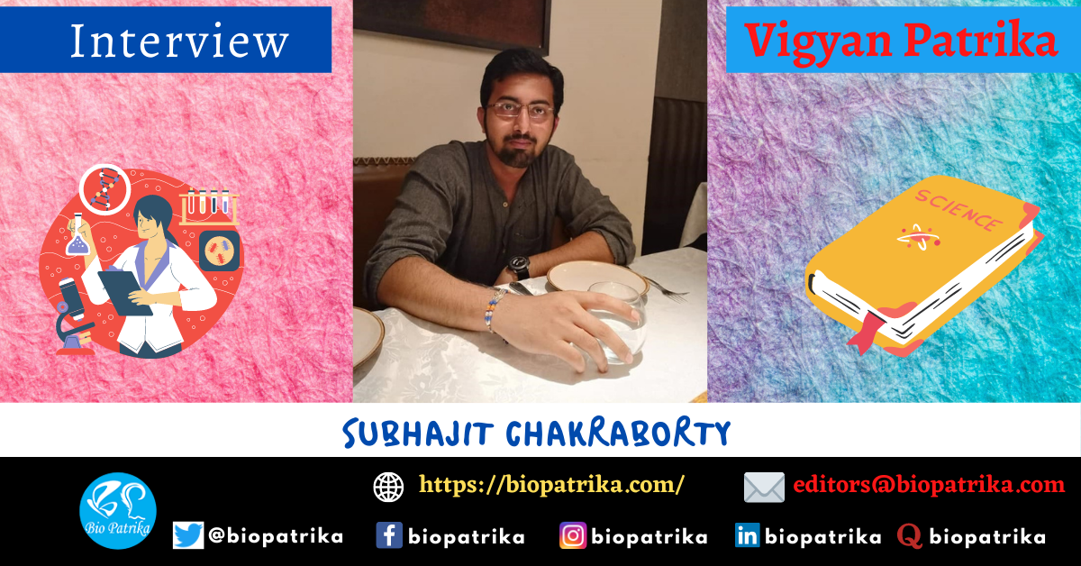Mr. Subhajit Chakraborty’s interview with Bio Patrika hosting “Vigyaan Patrika”, a series of author interviews. Subhajit is from West Bengal, India. He completed his B.Sc. in Chemistry from Ramakrishna Mission Vivekananda Centenary College, Rahara (2013). He did M.Sc. from the Presidency University, Kolkata in 2015. He joined the Ph.D. program (2016) in the Department of Chemistry of the Indian Institute of Science Education and Research Bhopal, under the supervision of Professor Saptarshi Mukherjee. His research work is mainly focused on the Fluorescence spectroscopy and development of luminescent metal nanomaterials to study their characteristic photophysical and morphological aspects and their applications in the various interdisciplinary field of sciences. Here, Subhajit talks about his work on ‘Protein-Templated Gold Nanoclusters as Specific Bio-Imaging Probe for the Detection of Hg(II) Ions in In Vivo and In Vitro Systems: Discriminating MDA-MB-231 and MCF10A Cells’ published in Analyst.