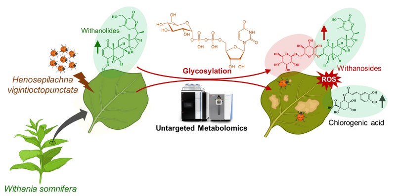 Research Summary: This study demonstrates herbivory-induced metabolic reprogramming in Withania somnifera, characterized by increased withanosides and phenylpropanoid accumulation, and highlights their roles in plant defense and potential insecticidal activity.
