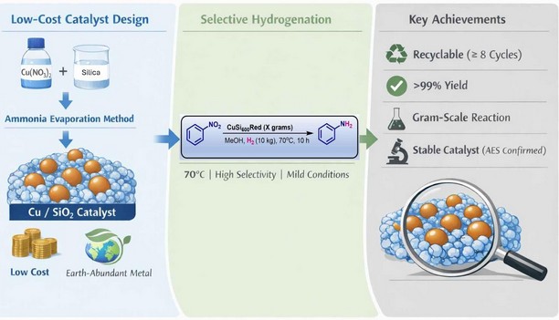 Research Summary: We developed a recyclable copper-silica catalyst that efficiently converts nitroarenes to anilines under mild conditions with >99% yield and excellent selectivity, offering a sustainable alternative to expensive noble-metal catalysts.