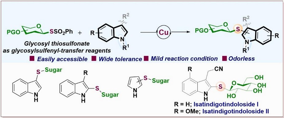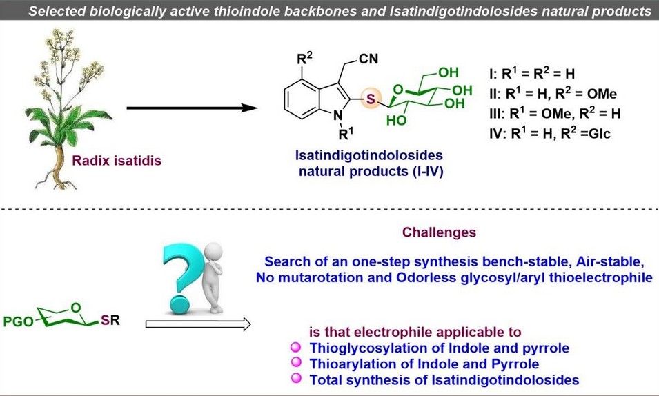 Research Summary: The current study enlightens the glycosyl thiosulfonate as a stable electrophilic reagent, enabling efficient synthesis of thioglycosylated and thioarylation of indoles, pyrroles, and facilitating the total synthesis of bioactive Isatindigotindolosides.