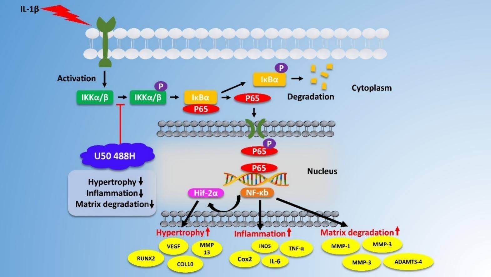 Potential molecular mechanism involved in U50 488H treatment in chondrocytes subjected to IL1-β. U50 488H KOR agonist mitigated ECM degradation, inflammation and chondrocyte hypertrophy via suppression of NF-Kb/ HIF-2α activation.