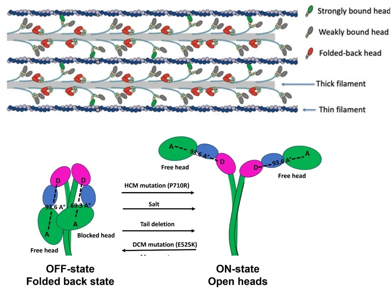 Every heartbeat is driven by a tiny motor protein called β-cardiac myosin in heart muscle. To pump the right amount of blood, whether at rest or during exercise, the heart must carefully control how many of these motors are active. Myosin can switch between an ON state (active, generating force) and an OFF state (inactive, resting).