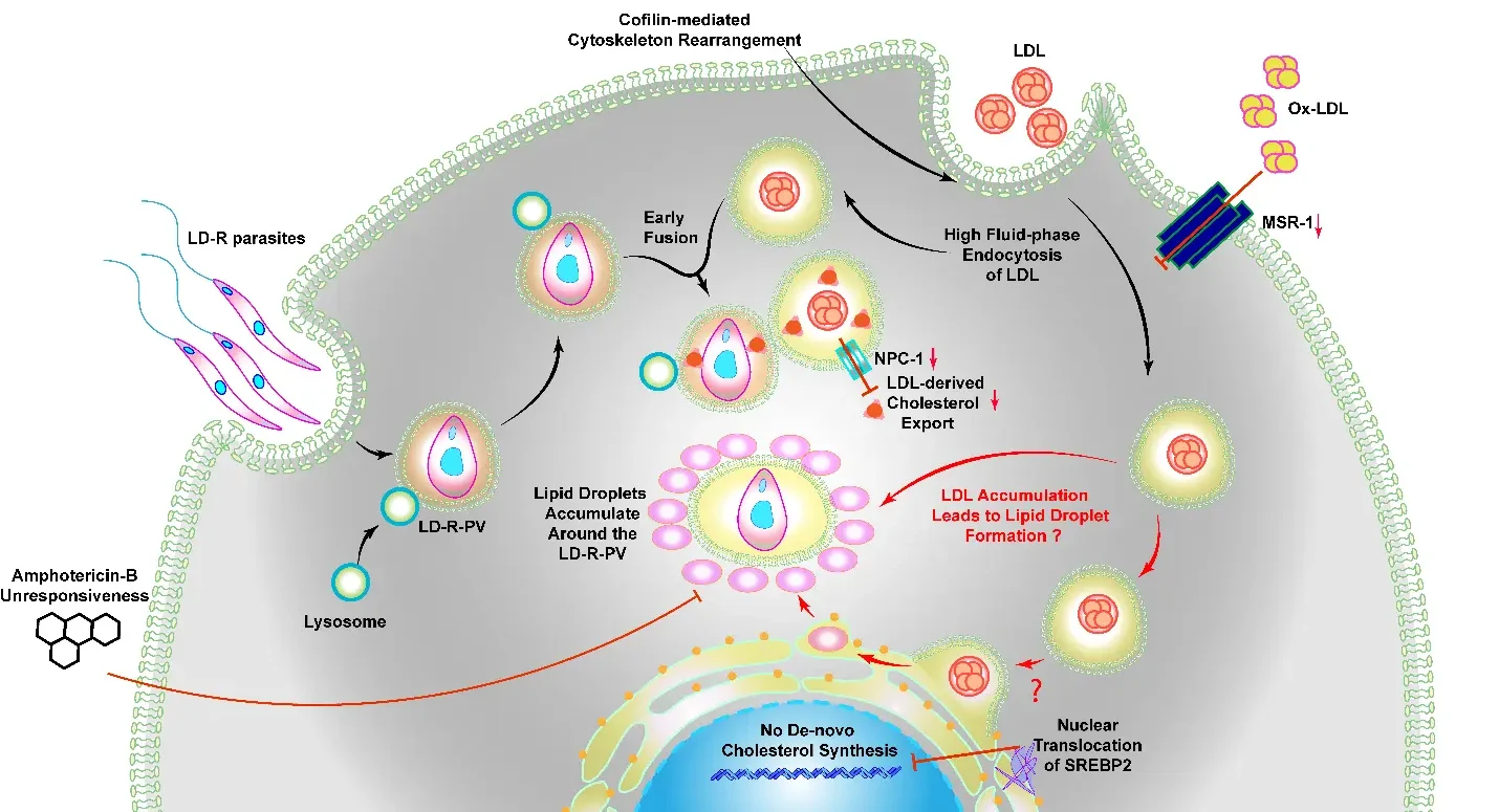 Further investigations pinpointed low-density lipoprotein (LDL) as the primary lipid source fuelling the rapid growth of drug-unresponsive Leishmania donovani parasites. Remarkably, we found that LDL uptake in infected macrophages occurred via cofilin-mediated fluid-phase endocytosis, effectively bypassing the classical LDL receptor (LDLr)-dependent pathway. This receptor-independent mechanism underscores the parasite’s ability to rewire host cellular processes to its advantage.