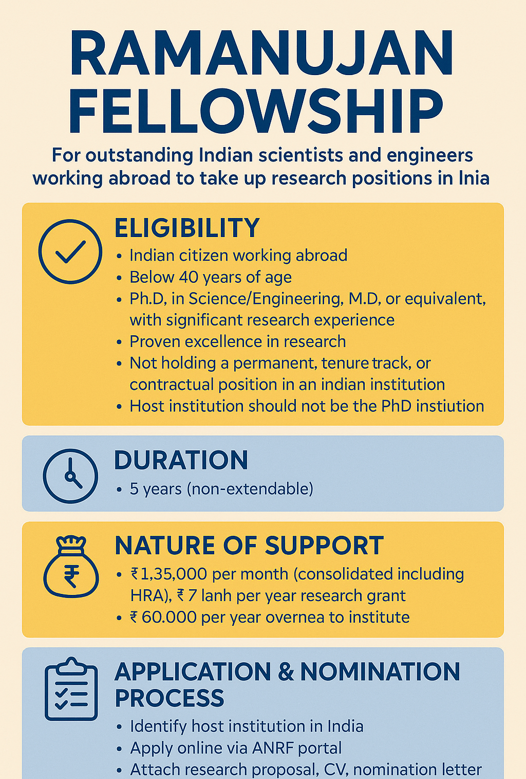 A prestigious fellowship for outstanding Indian scientists and engineers working abroad who want to return to India to pursue cutting-edge research at Indian academic or R&D institutions. It is highly selective, individual-centric, and aims to reverse brain drain.