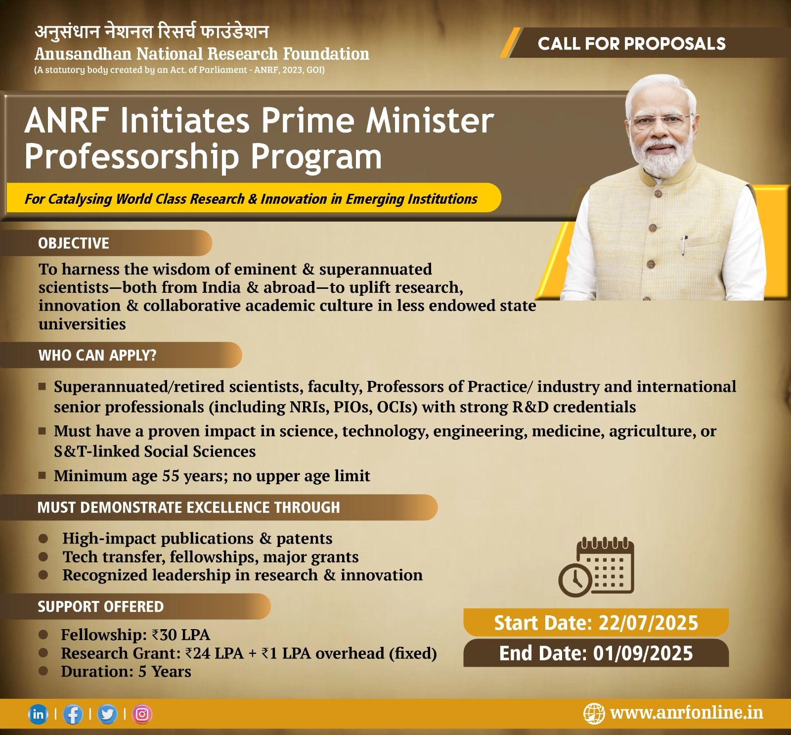 ANRF invites proposals for the Prime Minister Professorship to catalyze world-class research and innovation in emerging state universities of India.