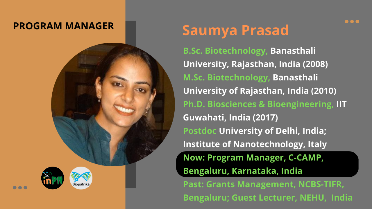 I was born in Varanasi, and raised in the lovely city of Shillong, Meghalaya, India. My father was a professor in the Zoology department at North-Eastern Hill University, Shillong, so I was naturally drawn to life sciences. Initially, I wanted to become a doctor, but I couldn’t pass the entrance exams. Instead, I chose to pursue biotechnology, as I believed it was a growing field. I then got my Bachelor’s and Master’s in Biotechnology from Banasthali University, Rajasthan. Afterward, I enrolled in a PhD program at IIT Guwahati. In addition to my academic accomplishments, I have had the opportunity to engage in post-doctoral and teaching work. Presently, I am employed as a Program Manager at C-CAMP. In addition to my studies, I have an avid enthusiasm for sports such as Cricket and Badminton. Furthermore, I relish visiting new destinations and enjoy travelling.