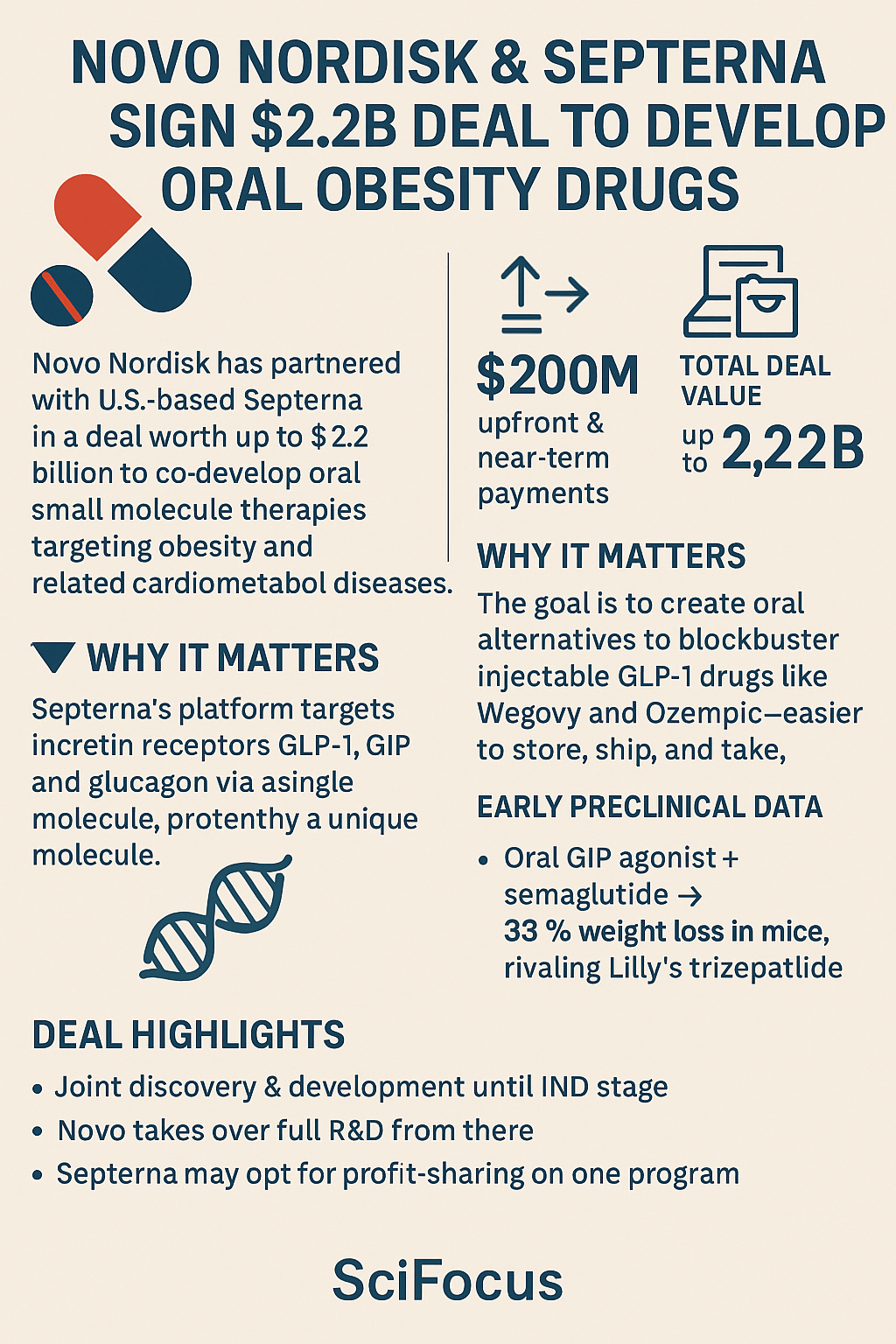 Novo Nordisk has partnered with U.S.-based Septerna in a deal worth up to $2.2 billion to co-develop oral small molecule therapies targeting obesity and related cardiometabolic diseases. This includes $200M upfront & near-term payments, with the rest tied to milestones.