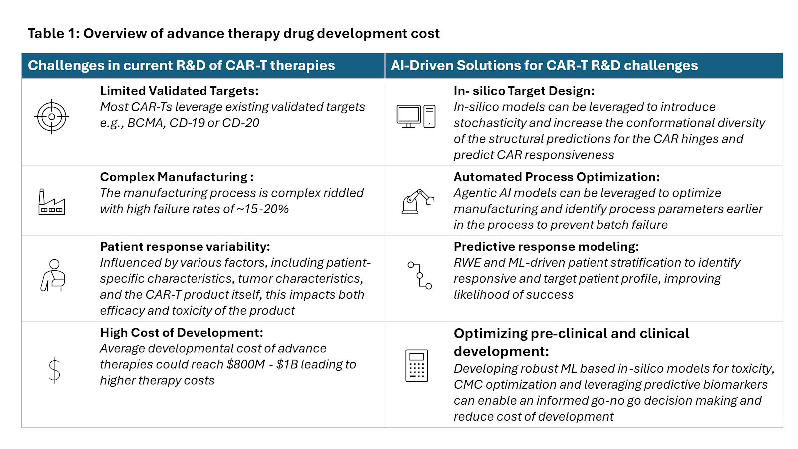 Chimeric antigen receptor T-cell (CAR-T) therapies have revolutionized treatment for heme malignancies like Multiple Myeloma, DLBCL etc., but these therapies face challenges in design, manufacturing, and patient management. AI is emerging as a powerful tool across the CAR-T value chain, from optimizing CAR designs in silico to improving manufacturing processes and personalized patient monitoring. Integrating AI can increase efficiency and lower costs in CAR-T development1, although it also introduces new considerations around data and validation.