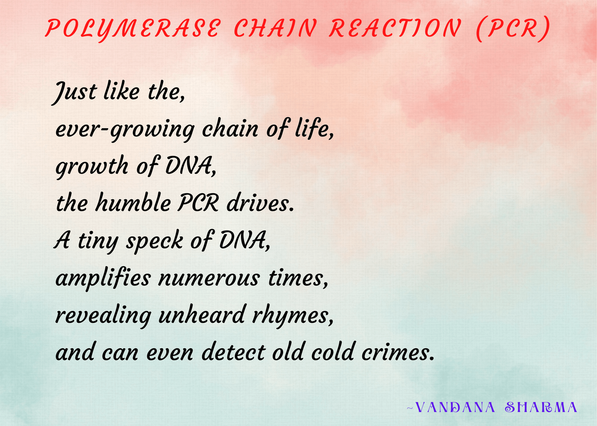 Vandana Sharma earned her PhD from AIIMS, New Delhi. Poetry writing is her hobby. Her poems (general and science) have been published in various national/international poetry and peer reviewed medical journals. Some of them are Harvests of New Millennium, Sky Island Journal, Rewrite Sunlight Anthology, Ashvamegh Magazine, VerbalArt, Borderless Journal, Consilience (peer reviewed science poetry journal), International Journal of Epidemiology.